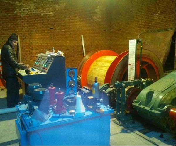 2、電機上下定子及轉(zhuǎn)子吊裝,用20T的吊車移到提升孔的位置;在吊裝到南門時,在主井井塔的提升孔的位置,把起重機鉤頭和吊車同時掛上吊點,一拉一松同步進行,使其停放在提升孔的位置;然后用起重機起吊,注意繩頭和包裝箱接觸的地方要用木板墊好,防止受力時損壞包裝箱進而損壞設(shè)備。JTPB-1.6×1.2防爆提升絞車導(dǎo)向輪的吊裝,等吊到第十三層時用5T千不拉配合起重機把導(dǎo)向輪牽引到六層井塔內(nèi),再用扒桿移動到合適位置即可。